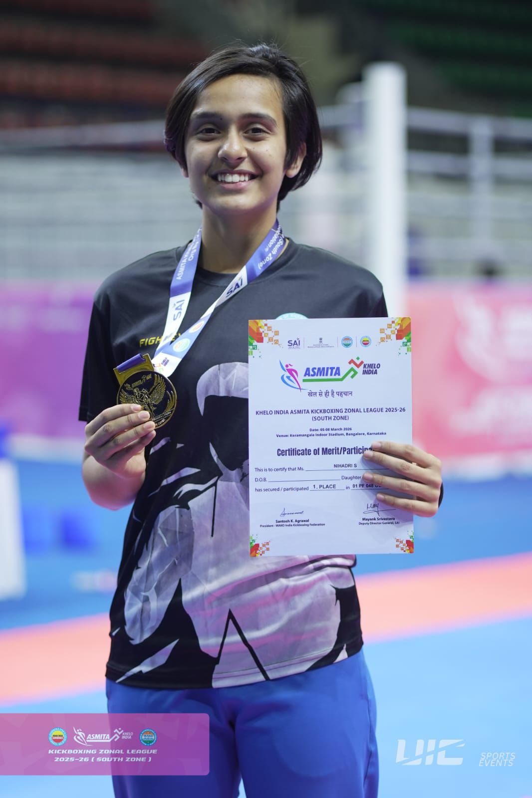कांचीपुरम/बेंगलुरु: तमिलनाडु के कांचीपुरम जिले के उत्तीरामेरूर की रहने वाली सीरवी निहाद्रि ने खेलो इंडिया अस्मिता किकबॉक्सिंग जोनल लीग 2025–26 (साउथ ज़ोन) में अपनी प्रतिभा का लोहा मनवाते हुए स्वर्ण पदक पर कब्जा जमाया है। बेंगलुरु के कोरमंगला इंडोर स्टेडियम में 5 मार्च से 8 मार्च तक आयोजित इस प्रतिष्ठित प्रतियोगिता में निहाद्रि ने 48 किग्रा ‘पॉइंट फाइट’ कैटेगरी में शानदार प्रदर्शन किया। इस जीत के साथ ही उन्होंने गोल्ड मेडल और ₹8000 का नकद पुरस्कार जीतकर अपने परिवार, समाज और पूरे तमिलनाडु राज्य का नाम रोशन किया है।
