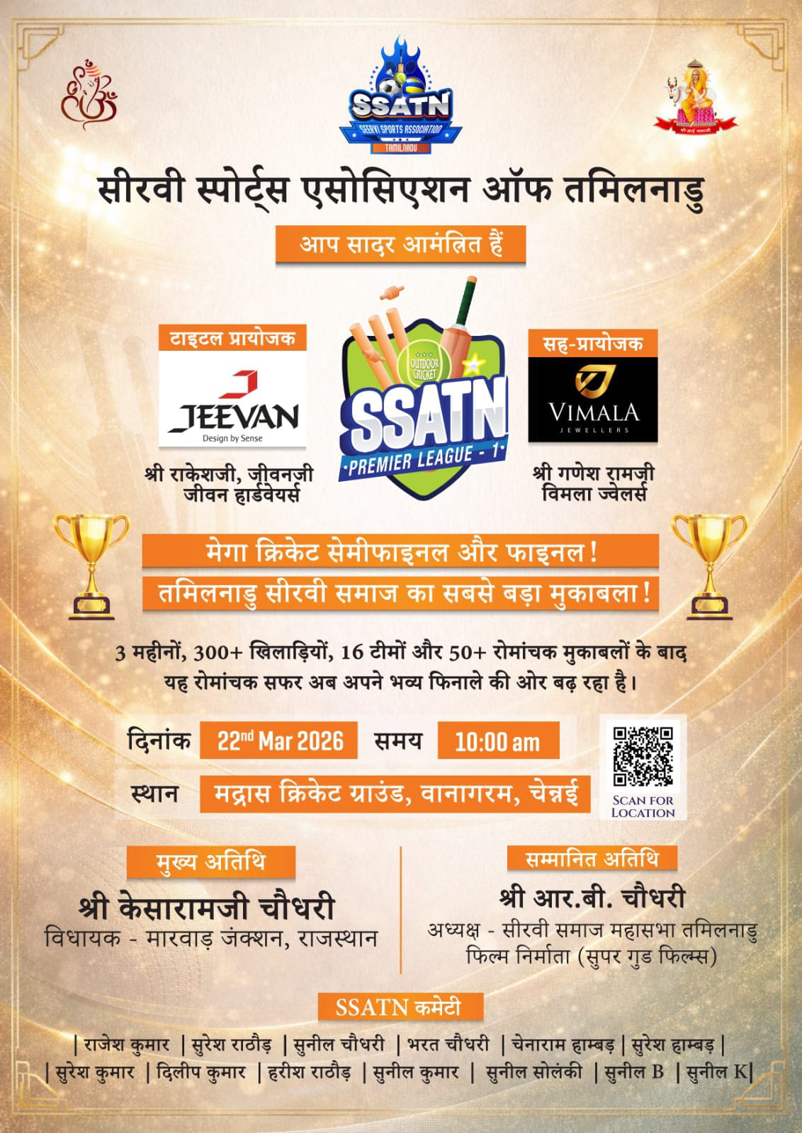 चेन्नई। सीरवी स्पोर्ट्स एसोसिएशन ऑफ तमिलनाडु (SSATN) के तत्वावधान में आयोजित ‘SSATN प्रीमियर लीग – 1’ का रोमांच अपने चरमोत्कर्ष पर पहुँच गया है। पिछले तीन महीनों से चल रहे इस खेल महाकुंभ का महा-मुकाबला (सेमीफाइनल और फाइनल) कल, 22 मार्च 2026 रविवार को मद्रास क्रिकेट ग्राउंड, वानागरम में खेला जाएगा।