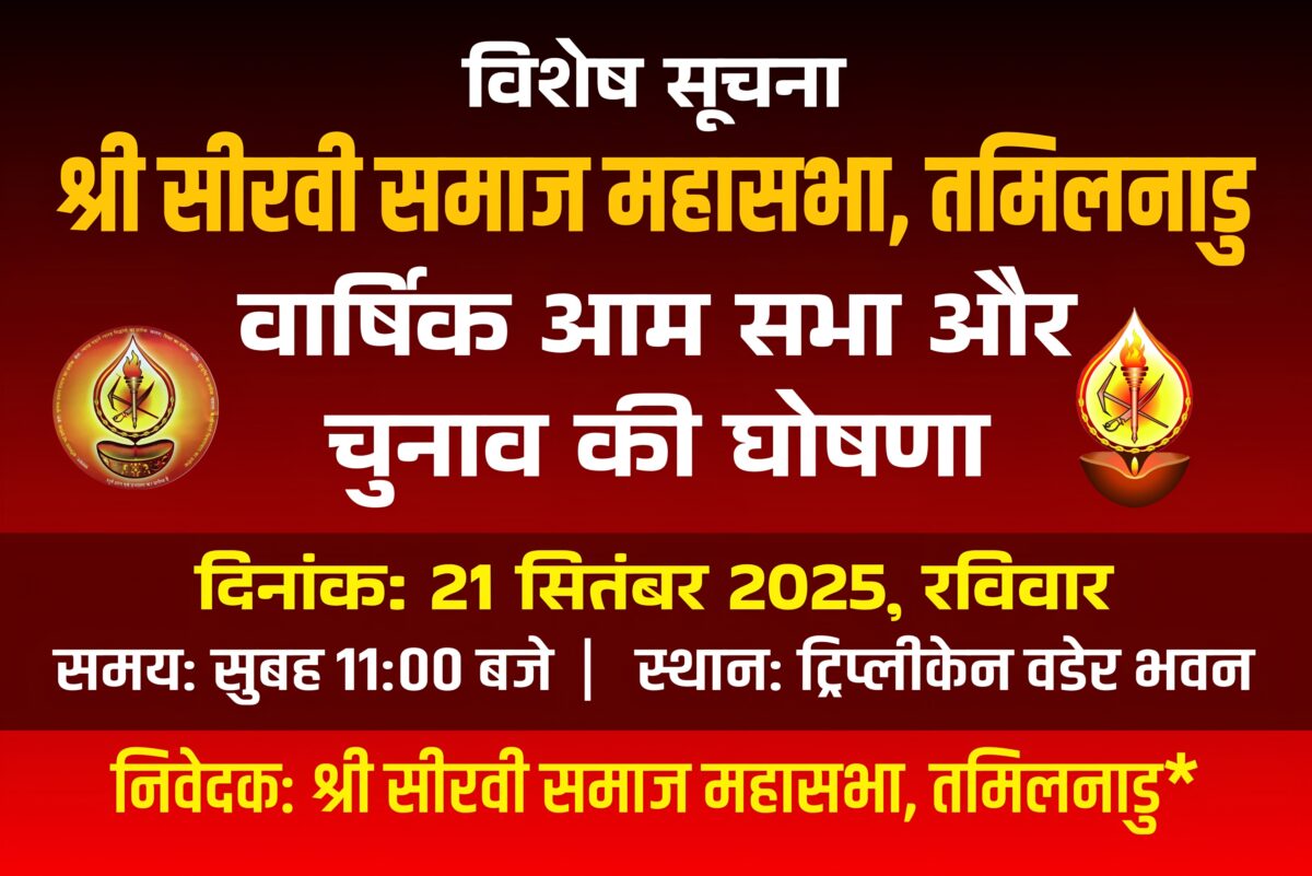 इस आम सभा में, तमिलनाडु में स्थित सीरवी समाज की सभी वडेरों से यह निवेदन है कि वे अपनी संस्था से दो योग्य सदस्यों का चुनाव कर उन्हें महासभा के आगामी प्रतिनिधि के रूप में नामित करें। इन प्रतिनिधियों के नाम, अपनी संस्था के लेटरहेड पर अध्यक्ष के हस्ताक्षर सहित, *दि. 15 सितंबर 2025 तक ट्रिप्लीकेन वडेर भवन में जमा कराना अनिवार्य है ।*
